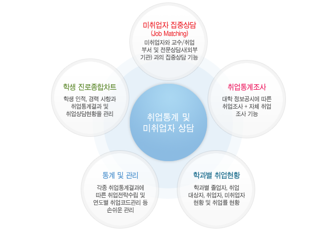 ´ëÇÐÁ¤º¸°ø½Ã¿¡ µû¸¥ °Ç°º¸Çè, ±¹¼¼DB Åë°èÁ¶»ç ±â´É°ú ´ëÇÐ(±³) ÀÚü Á¶»ç°¡ °¡´ÉÇϸç, ¹ÌÃë¾÷ÀÚ¿¡ ´ëÇÑ ±³¼ö/Ãë¾÷ºÎ¼ ¹× Àü¹® »ó´ã»ç(¿ÜºÎ±â°ü) ÁýÁß»ó´ã ±â´ÉÀ» Á¦°øÇÕ´Ï´Ù.